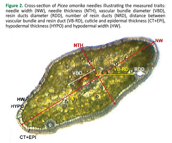 Needle length (NL) was measured with digital calliper Powerfix, while nine other needle traits, i.e. needle width (NW), needle thickness (NTH), vascular bundle diameter (VBD), resin ducts diameter (RDD), number of resin ducts (NRD), distance between vascular bundle and resin duct (VB-RD), cuticle and epidermal thickness (CT+EPI), hypodermal thickness (HYPO), and hypodermal width (HW) (Figure 2), were examined using a Leica Gallen III light microscope and a Topica TP/5001 (model CCD) camera. Needle cross-sections were made with a razor blade in the central part of the needles. Observations were carried out on 15 (six populations) or 10 (MIL population) trees per population and on 10 needles per tree. In total, approximately 1000 needles were measured.