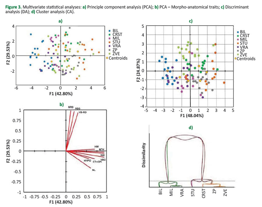 Figure 3. Multivariate statistical analyses: a) Principle component analysis (PCA); b) PCA – Morpho-anatomical traits; c) Discriminant analysis (DA); d) Cluster analysis (CA).