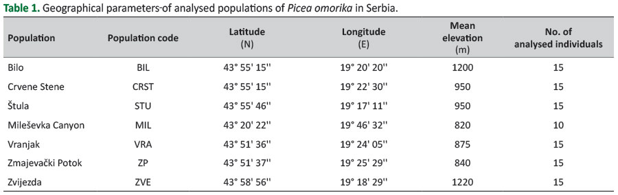 Table 1. Geographical parameters of analysed populations of Picea omorika in Serbia.