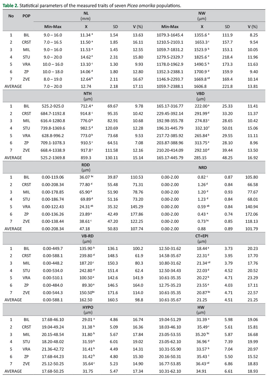 Table 2. Statistical parameters of the measured traits of seven Picea omorika populations.