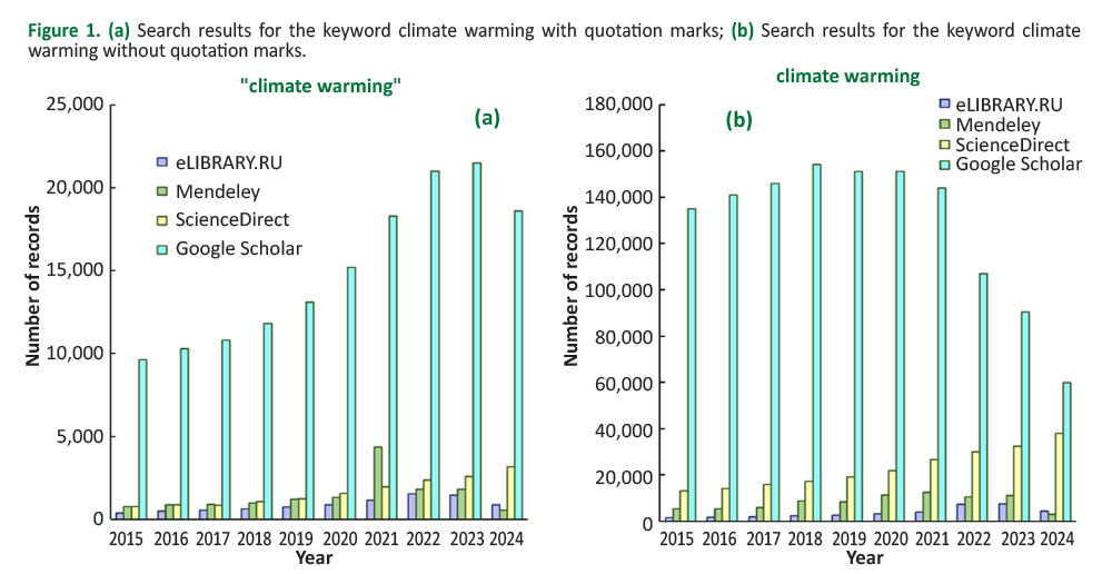 Climate warming represents one of the most pressing environmental issues currently in the world. A substantial corpus of publications on this issue was revealed by a search by the relevant search engine (Figure 1). It was confirmed that Google Scholar search provides the largest number of entries. However, it is noteworthy that two similar queries, namely "climate warming" and climate warming, yielded divergent results. In the context of the present study, it was found that the utilization of the keyword "climate warming" resulted in a significantly lower number of records being identified in comparison to the utilization of the same keyword without quotes. However, an interesting point is that in the first case, there was an increase in the number of records found, and in the second, there was a decrease (Figure 1). An analysis of the number of records obtained through the use of alternative search engines confirmed the trend of an increase in the number of records in both cases. Consequently, it can be deduced that there is a persistent upward trend. A further noteworthy finding is the identification of similarities in the number of records for ScienceDirect, Mendeley, and eLibrary when employing the search query "climate warming" for most of the studied time period. Conversely, when employing climate warming as a search query for most of the studied time period, ScienceDirect yields a greater number of records than Mendeley and eLibrary.