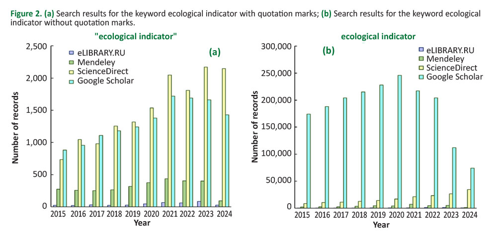 Keywords: Google Scholar; ScienceDirect; Mendeley; eLIBRARY.RU; ecology; economics; machine learning