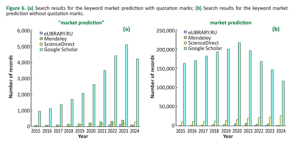 When conducting a search for the term "financial market", Google Scholar returns the highest number of results (Figure 5). However, it should be noted that Mendeley has consistently ranked second in terms of the number of records for a number of years. A similar pattern was identified during the search for "market prediction" (Figure 6).