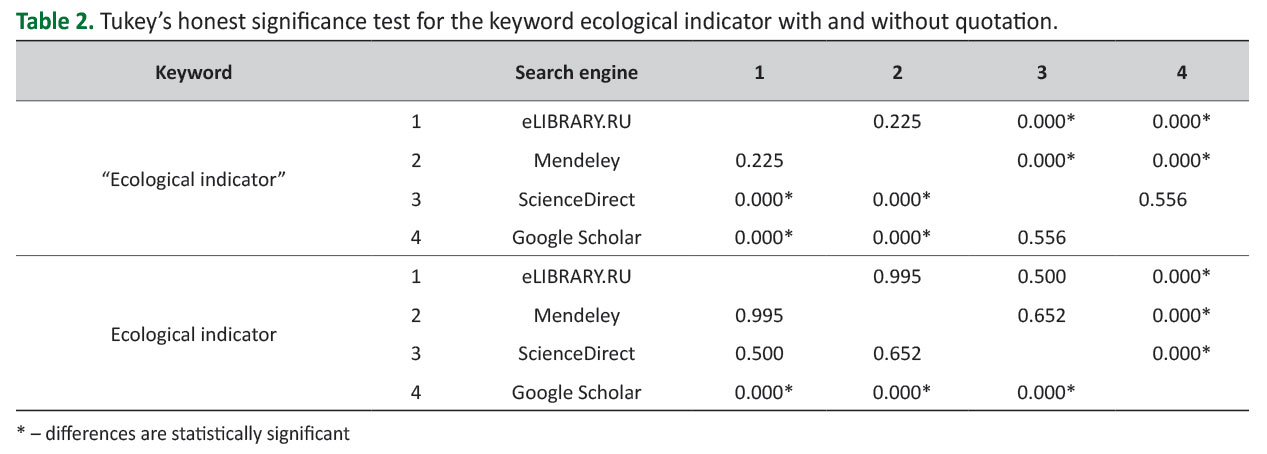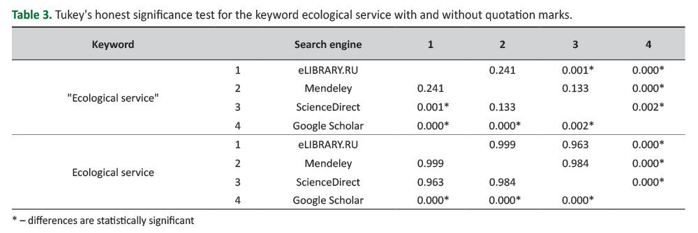 ANOVA revealed significant differences in the search results for the keyword "ecological indicator", both with and without quotation marks (F(3, 36) = 23.796, p = 0.00000 and F(3, 36) = 91.58, p = 0.0000, respectively). Tukey's test revealed statistically significant differences in the search results obtained using Google Scholar compared to those obtained using all other search engines. Statistically significant differences in search results were also revealed when using the keyword "ecological service" in eLibrary RU and ScienceDirect (Table 3).