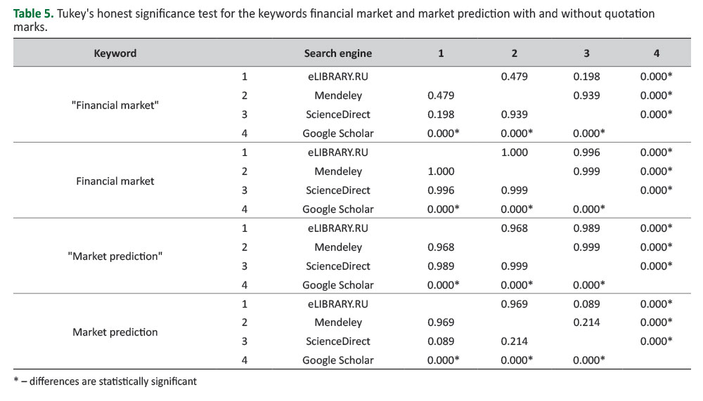 The choice of a search engine was also a significant factor (F(3, 36) = 404.28, p = 0.00000 and F(3, 36) = 60.794, p = 0.00000 for financial market with and without quotation marks, respectively; F(3, 36) = 29.452, p = 0.00000 and F(3, 36) = 322.13, p = 0.00000 for market prediction with and without quotation marks, respectively).