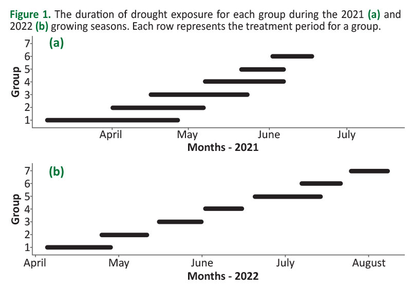 Drought stress was simulated by withholding water from seven experimental groups, whereas the control group was kept well-watered for the duration of the experiment. In the first year of the experiment (2021), drought stress was induced by termination of irrigation and applied sequentially, with each of the seven groups exposed at different times between early March and mid-July, at intervals of approximately 20 days (Figure 1). Irrigation was discontinued for the first group shortly after leaf emergence (early March) to induce the first drought treatment period and each subsequent group was exposed once the majority of plants in the preceding group exhibited visible symptoms of drought stress and their mass (including container) had declined to about half of the initial value.