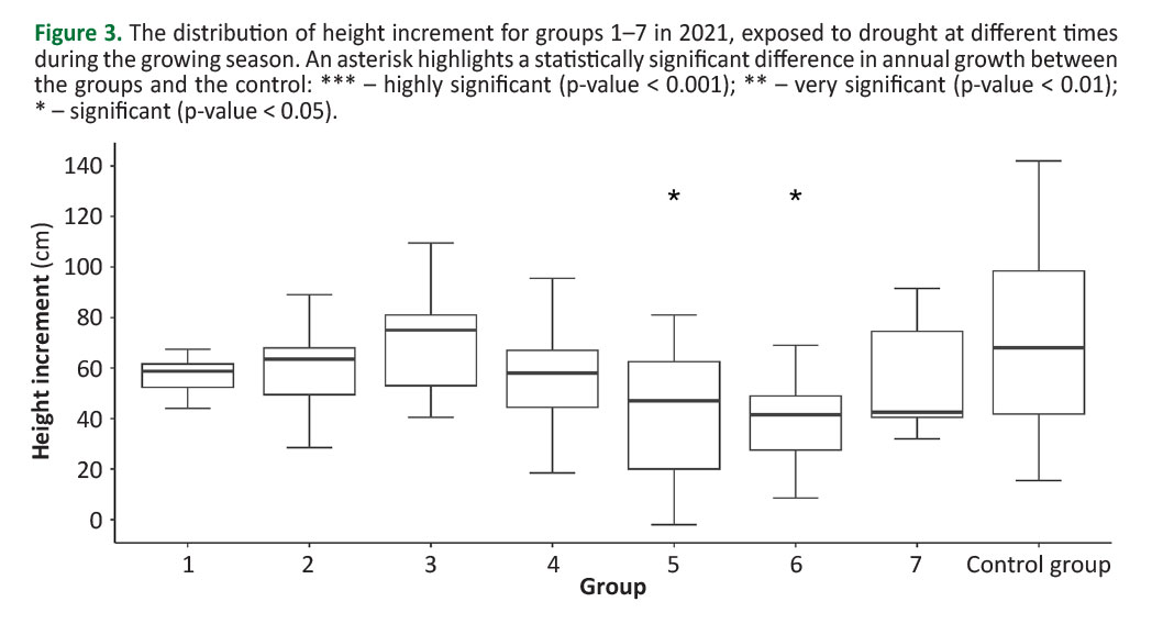 An average decrease in height growth was observed in all groups after the first year of exposure to drought stress, with a statistically significant decrease in groups 5 and 6 (Figure 3). The minimal growth observed in groups 5 and 6 may be related to the interaction of drought stress with elevated temperatures during June/July, although this remains a possible explanation rather than a confirmed effect. High temperatures are to be expected during this period of the year, even though they were not directly measured in the greenhouse. Similar interactions between drought and high air temperatures have been reported to negatively affect growth in Pinus edulis Engelm (Adams et al. 2015).