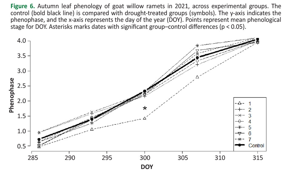 A significantly higher growth was recorded in groups 4 and 5 compared to the control in 2022. On average, groups 3 and 6 also showed higher growth compared to the control, although these differences were not statistically significant (Figure 4). It can be assumed that the higher height growth is actually a result of the combined effect of drought stress in 2021 and 2022. Namely, this is due to its impact on leaf phenology (prolongation of vegetative activity) and the increase in non-structural carbohydrates (NSC) as a result of compensatory growth. It is important to consider that the plants were subjected to drought stress in 2021, which may have resulted in an increase in NSC. The increase in NSC content in plant tissues is a common physiological response to drought stress, contributing to defense against future drought periods (O’Brien et al. 2014). It has been proven that plants exposed to drought have significantly higher NSC levels than plants not subjected to drought the previous year (Tomasella et al. 2019). Although higher growth was not recorded in 2021 as it was in 2022, it can be assumed that the reason lies in the lower intensity of drought stress that year. Also, although the plants in groups 4 and 5 likely increased assimilation after drought stress, this did not reflect in their current height growth due to the pattern of height growth in willows (i.e., culmination of height growth at the beginning of the growing season). Therefore, it seems convincing that after drought stress in 2021, plants in groups 4 and 5 stored an increased amount of NSC and utilized it during the period of intensive height growth in 2022. In addition to the response to the 2021 drought, plants have the ability of so-called compensatory growth, as a response to recovery in the same year. The concept of compensatory growth involves increasing assimilation above values that were present before the drought stress (Arend et al. 2016, Gessler et al. 2020). Therefore, we can highlight three possible reasons for the higher growth in groups 4 and 5, namely: higher NSC levels as a result of recovery from the 2021 drought; the absence of drought stress during the period of intensive height growth in 2022; prolonged growing season in 2022 due to drought-induced delay in leaf senescence (Figure 7). More intensive height growth after the second year of exposure to drought stress may be a result of a “carry-over” effect on leaf phenology and growing season length (Figures 7 and 8), as well as a likely increase in NSC. Generally, the growth response to drought stress depends on the interaction between the timing of drought stress induction and the growth phenology specific to each individual tree species (Kozlowski 1964, Kannenberg et al. 2019, Van Kampen et al. 2022).