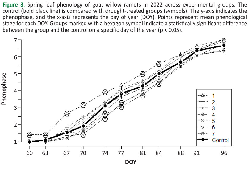 In this study, goat willow ramets exposed to drought at different times during the growing season (in 2021) showed shifts towards earlier or delayed budburst in spring 2022 (Figure 8). Groups exposed to drought stress from March to early June (groups 1, 2, 3, and 4) on average leafed out earlier than the control group. Groups exposed to drought stress from early June to mid-July (groups 5, 6, and 7) leafed out later than the control group. It can be clearly seen that different times of drought stress induction affect shifts in spring phenology in different directions compared to the control group. It is known that drought stress caused delayed budburst in pedunculate oak (Quercus robur L.) (Vander Mijnsbrugge et al. 2016), while some authors report earlier budburst in Quercus ilex L. and Quercus coccifera L. (Sanz-Pérez and Castro-Díez 2010), whereas in pedunculate oak, drought stress caused delayed budburst in one year, followed by early budburst the next year (Čehulić et al. 2019). Čehulić et al. (2019) hypothesize that the different time periods during which plants are exposed to water deficit during the growing season probably cause a “carry-over” effect, resulting in different leaf-out times. Therefore, it can be assumed that drought stress caused an epigenetic (memory) imprint, and the timing of stress induction conditioned different budburst times. Through genetic or biochemical reactions to stressful factors, the plant acquires a so-called stress imprint, which determines the plant's response to overcoming future stresses (Bruce et al. 2007). It is now known that plants, to cope with acute stress, have developed mechanisms that recognize undesirable conditions and respond to them through DNA methylation, histone modification, or chromatin remodeling without changing the nucleotide sequence (Madlung 2004, Bruce et al. 2007). Additionally, it is important to note the role of plant hormones, such as abscisic acid (ABA), which participate in the expression of specific genes that can be linked to drought stress (Chaves et al. 2003).