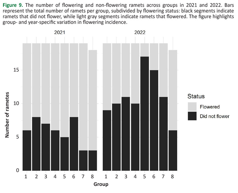 In 2021, there was no statistically significant difference in the number of flowering ramets between the treatment groups and the control group. In 2022, the results of Fisher’s exact test showed that group 5 (p-value = 0.000547) and group 6 (p-value = 0.006275) had a statistically lower number of ramets that developed flowers compared to the control group.