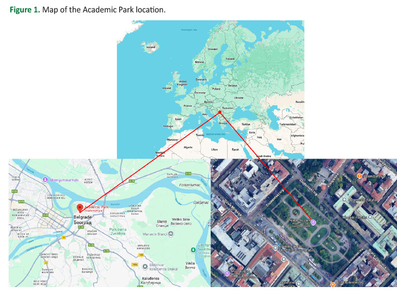 The study was conducted in Academic Park (44.81953° N; 20.45784° E), a city park in Belgrade, the capital of the Republic of Serbia.