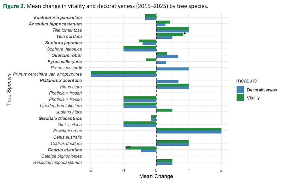 Across all species, changes in tree vitality and decorativeness were generally modest, with most species showing small positive or negative shifts between 2015 and 2025. Significant declines in vitality were observed in Cedrus atlantica (p=0.002), while a significant improvement in vitality was found for Tilia cordata (p=0.037). Decorativeness showed a significant increase only in Platanus × acerifolia (p=0.040). For other species, changes were not statistically significant.