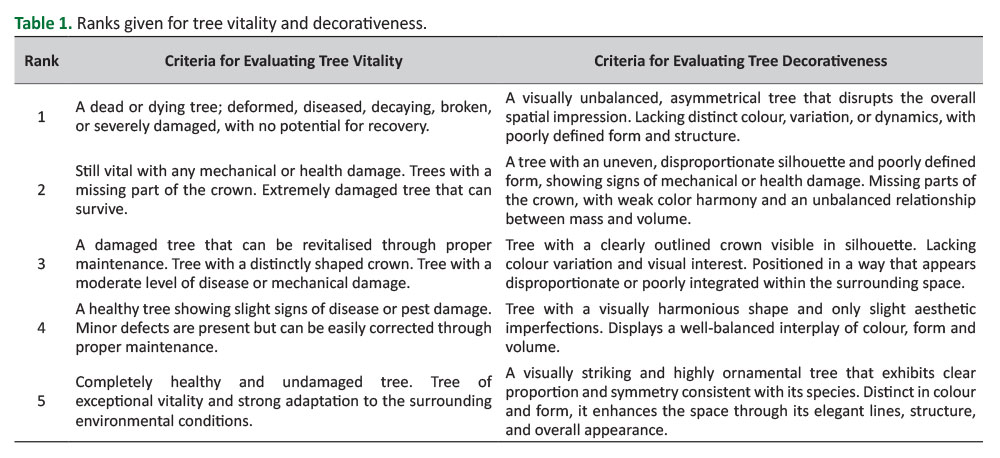 The study was conducted in 2015 and 2025. A total of 132 trees were identified and examined across the designated study area in 2015, and 121 in 2025. Data were collected using the basic Visual Tree Assessment (VTA) method (Mattheck and Breloer 1994). The tree condition was evaluated based on vitality and aesthetic quality. Aesthetic quality (decorativeness) was evaluated on a five-point scale, and vitality was assessed using measurements of height, trunk length, and crown width, and also rated on a five-point scale (Table 1) (Stojanović et al. 2021).