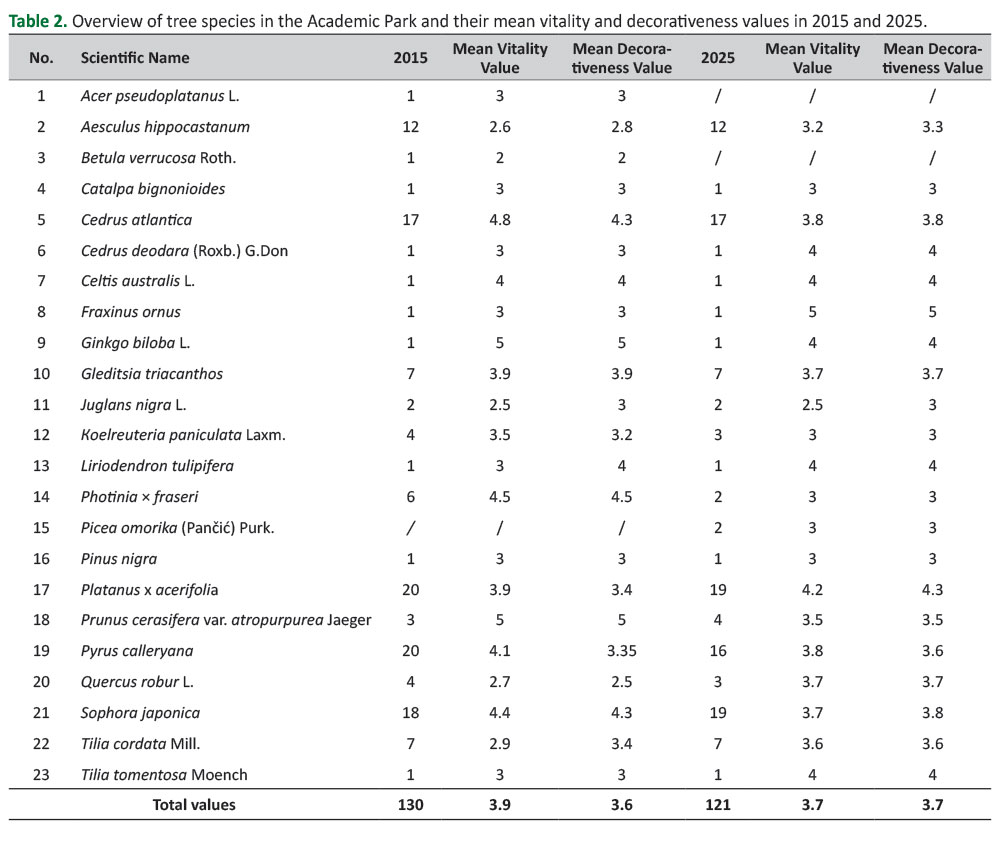 Urban green spaces are essential components of sustainable cities, providing ecosystem services that mitigate climate change impacts, reduce air pollution, regulate urban temperatures, and support human well-being and biodiversity (Lin and Li 2025). In addition to ecological benefits, trees make a significant contribution to the cultural landscape through their ornamental value. However, ornamental appeal is often associated with a physiological condition. Urban greenery faces multiple challenges, including pollution, habitat fragmentation, compacted soils, and increasing pest and disease pressures that threaten the vitality of urban trees and shrubs (Ćirković-Mitrović et al. 2016). Tree vitality, representing health and vigour, may directly influence aesthetic perception, but long-term data are limited. The objective of this study was to quantify changes in vitality and ornamental value across species over a 10-year period and to assess their correlation, providing insight for horticultural management in urban parks.