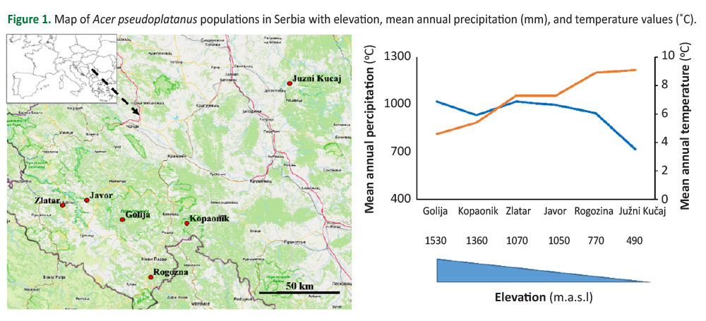 Material for the analysis of variability of samara morphological traits in analysing morphological variability of sycamore maple populations was collected in six natural populations in Serbia (Figure 1). Each population is represented by 11 trees, and each tree by 30 healthy and undamaged samaras. Samaras were collected from regularly developed, isolated trees or trees on the forest's edge because, in those positions, their phenotype was fully expressed to show the recent state of the species without changes caused by cultivation measures (Zebec et al. 2010). A total of 1,980 samaras were collected and morphometrically processed. To prevent sampling genetically related trees, it was ensured that the sycamore maples were spaced at least 50 meters apart (Poljak et al. 2012). The tree's fruit, known as a samara, has a single seed with a flat, wing-like structure that helps it get carried by the wind. This design allows the seeds to travel over long distances. The colour and size of a samara can change depending on the local climate, such as temperature and humidity. Samaras for morphometric analysis were collected in October 2022. The analysed populations are located in the territory of Serbia at elevations ranging from 1530 to 490 m.a.s.l. Climatic factors like mean annual precipitation (MAP [mm]), mean annual temperature (MAT [˚C]), and their relationship were specific concerning the elevation of the locality (Figure 1).