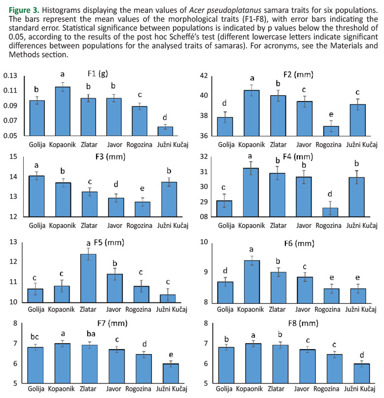 Population analyses of samara morphology enable integrating the findings into forest breeding programs to improve seed dispersal efficiency, regeneration success, and overall forest management. The establishment and distribution of this species can be influenced by choosing the specific samara characteristics. This study aims to quantify and analyse the morphological diversity of samaras across different populations, investigating the potential influences of environmental and geographical factors on their dispersal capabilities. Research related to the morphological traits of sycamore maple samaras is quite rare, especially at the population level. The study of the morphological traits of sycamore maple samara from different parts of its natural range enables the assessment of variability between and within populations based on adaptation to a wide range of climatic conditions of the species' range. This variability in samara characteristics enables obtaining seed material from populations that are already adapted to specific environmental conditions and is the basis for future breeding programs.