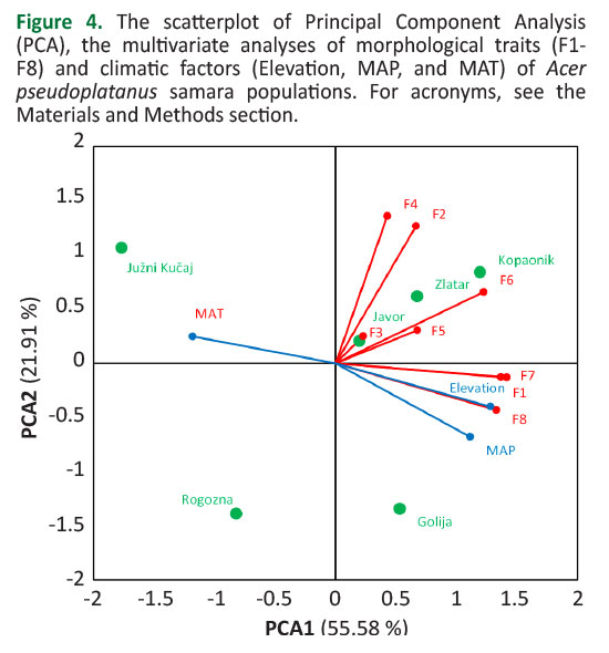 Population-specific variation in the sycamore maple (Acer pseudoplatanus) samara characteristics was examined to understand how geographic and environmental factors shape the samara’s weight and morphology. Variability of samaras of six sycamore maple populations from different regions of Serbia, differing in elevation (from 1530 to 490 m.a.s.l.), mean annual precipitation and temperature, was analysed based on samara traits describing samara weight and length, and wing length and width. The significant differences between the populations' mean values for the analysed A. pseudoplatanus samara traits were determined using the post hoc Sheffé's test results. The samara weight was the highest in the Kopaonik population compared to Južni Kučaj, the population at the lowest elevation with the highest temperature and minimal precipitation throughout the year. The highest values for all samara traits were observed in the Kopaonik population. The wing length was smallest in the Golija population (1530 m.a.s.l., low temperature) and the Rogozna population (770 m.a.s.l., high temperature), with similar precipitation levels. The ANOVA results suggest that environmental and genetic factors influence samara weight and morphologya. According to the results of multivariate analyses, Principal Component Analysis (PCA) and Agglomerative Hierarchical Clustering (ACH), ecological factors such as elevation and mean annual precipitation significantly influence the variation in samara traits among A. pseudoplatanus populations, with distinct patterns observed in weight and morphology across different localities. The observed variation in samara weight and morphology reflects the adaptation of A. pseudoplatanus populations to local environmental conditions. Further research is needed to investigate the adaptive significance of these traits, particularly in relation to seed dispersal strategies and their influence on forest dynamics.