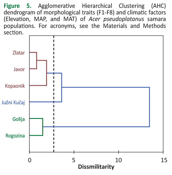 The agglomerative hierarchical clustering (AHC) analysis revealed distinct clusters based on samara traits and environmental conditions. The dendrogram illustrates that populations are grouped (at a distance threshold of 2.77) into three clusters based on their similarity. The Južni Kučaj population formed one cluster, Kopaonik, Javor, and Zlatar formed the second, and Golija and Rogozna formed the third (Figure 5). The highest MAT values, the lowest elevation, and MAP in the Južni Kučaj population resulted in samaras with the lowest samara weight and lowest values of other samara traits, as well as small wing length. The second cluster (Kopaonik, Javor, and Zlatar populations) had similar MAP and MAT values and exhibited similar values of samara weight, wing length, samara length, and samara width. The populations in the third cluster have a low samara length (F2) and wing length without seeds (F4). The average characteristics of the Golija and Rogozna sites differ (elevation 1530 m vs. 770 m a.s.l.; MAT 4.6°C vs. 8.9°C, respectively), while the MAP values were similar, which probably led to similar samara morphological traits in populations on these sites.