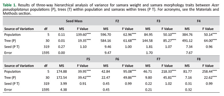 The three-way hierarchical analysis of variance was performed to assess effect of examined sources of phenotypic variability of the samara traits: the effects of population (P), trees nested within populations (T) and samaras nested within trees. The analysis revealed that population (P) significantly influenced both samara weight and samara morphology traits (F1-F8), suggesting that environmental factors at the population level play a significant role in these traits (all p < 0.05). Trees within the population (T) had a considerable effect on all analysed samara traits, indicating considerable genetic variability among trees within the population (for all morphological traits: p < 0.05). No significant effects were found for samara-level variability (for all morphological traits: p > 0.05). These results suggest that besides environmental and genetic factors, too influence samara weight and morphology between and within the examined A. pseudoplatanus populations (Table 1).