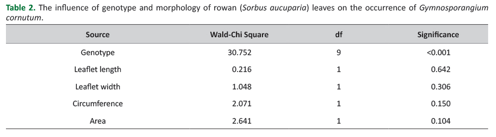 Binary logistic regression was used for testing the influence of genotype, leaf blade length, leaf blade width, leaf circumference, and leaf area of Sorbus aucuparia on the occurrence of Gymnosporangium cornutum aecia. The exponential parameter estimates were used to calculate the probability of aecia occurrence.