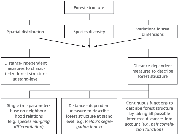 FIGURE 1. The overview of the three major characteristics of forest structure and the groups of variables by which forest structure was assessed (Pommerening [15] modified from Albert [16])