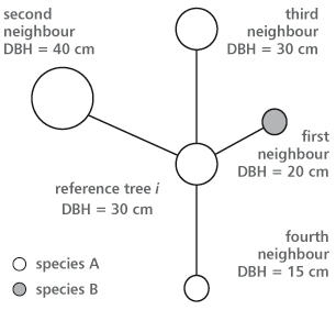 The species mingling index and the diameter differentiation index observe the reference trees and at least three (or four) of their nearest neighbours. Such a group of trees is called a structural group of four (Figure 2).