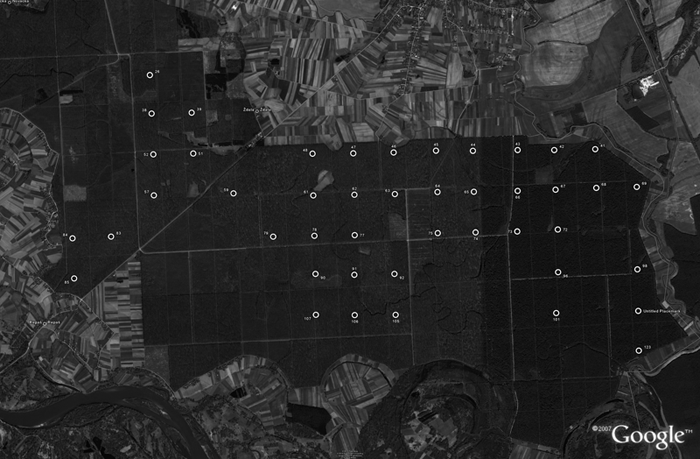 The data used in this study were collected from 45 sample plots located in the Repaš – Gabajeva Greda forest management unit. The sample plots were set and measured from April 7, 2000 to February 13, 2001. The location of the samples was determined by the North-South (East-West) oriented, 500 m square grid, laid over the entire surface of the observed area (Figure 3).