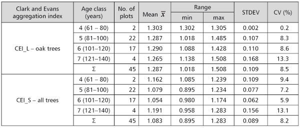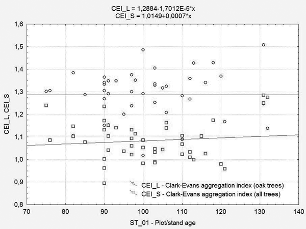 For each individual sample plot, the aggregation index of Clark and Evans (CEI) was calculated, with no correction for edge effects, in two instances. In the first case there were only pedunculate oak trees taken into consideration. All trees were considered in the second approach. This was the way of finding out the aggregation degree of oak trees in the upper part of the stand regarding the overall aggregation index when all trees were considered.
