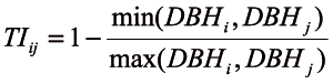 The diameter differentiation index (TIij) describes the spatial distribution of tree diameters. For the reference tree ‘i’ and its n=3 or the 4 nearest neighbouring trees, ‘j’ the diameter differentiation index (TIij) was defined as shown below (Equation 7):
