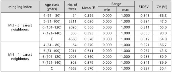The mean value of the species mingling index for all 45 plots (all age classes) was 0.570 when 3, and 0.594 when 4 neighbours were taken into account. The majority of the sample plots indices were between 0.6 and 0.8.
