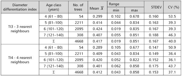 The diameter differentiation index was calculated for all trees. For the overall plot its value was derived as an average index of individual trees on the plot. As it was the case with the species mingling index, there were two approaches: calculations with 3 and 4 nearest neighbouring trees.