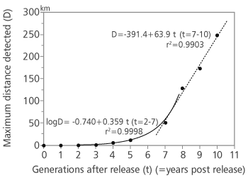FIGURE 2. Range expansion of Torymus sinensis, relationship between the number of generations (t) after the release in Japan (Tsukuba) in 1982 and maximum distance (D) from the release site to the locality where T. sinensis has been detected (source Moriya et al. [22, 23])