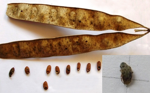 FIGURE 1. Bruchidius terrenus in Albizia jullibrisin, damaged pods, seeds and adult insect (Orig.)