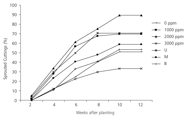 FIGURE 1. Sprouting of D. tripetala cuttings using different IBA hormone concentrations and nodal positions (U = upper node, M = middle node and B = basal node)