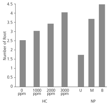 FIGURE 2. Number of root produced in D. tripetala cuttings using different IBA hormone concentrations (HC) and nodal positions (NP) (U = upper node, M = middle node and B = basal node)