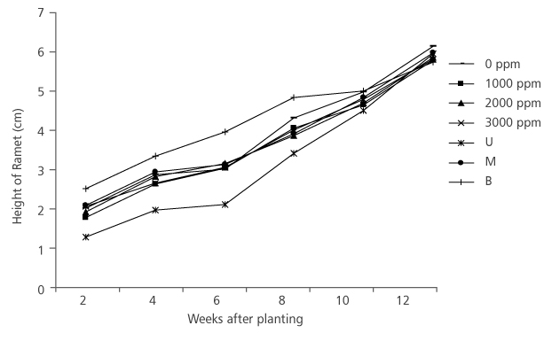 FIGURE 3. Height growth of D. tripetala’s Ramets using different IBA hormonne concentrations and nodal positions (U= upper node, M = middle node and B = basal node)