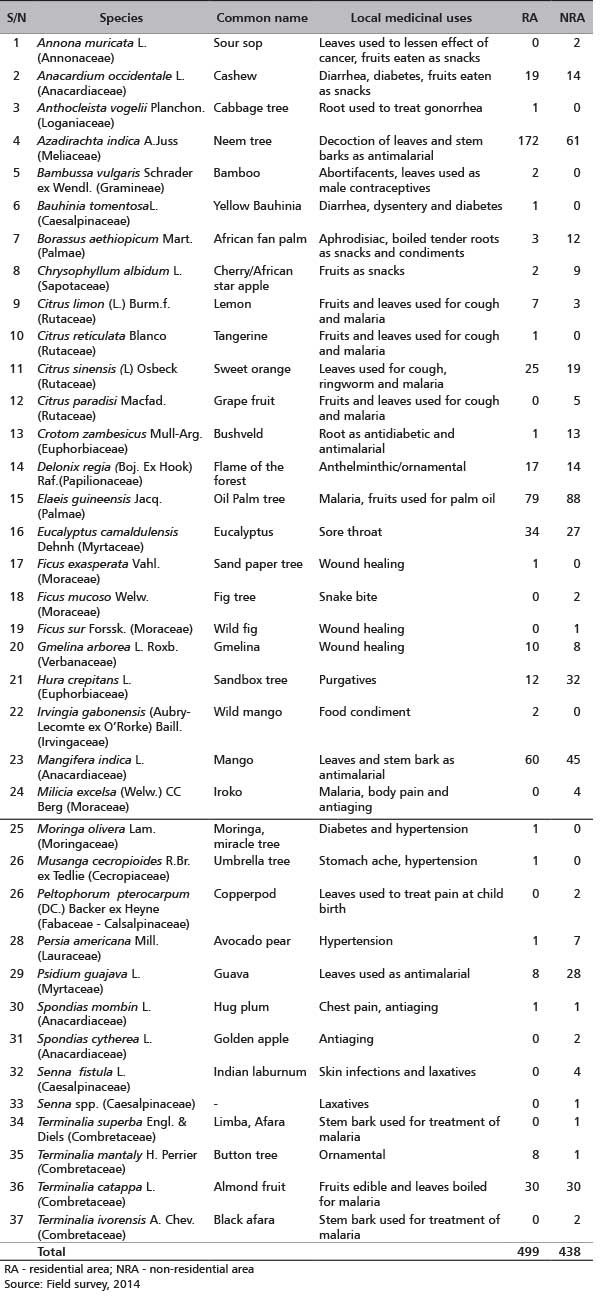 Results: A total of 37 ethno-medicinal trees species were found in the study area, while the species composition was 499 in the residential area and 438 in the non-residential area. Azadirachta indica was the highest (233) in composition. Ethno-medicinal tree species in the study area consist of 19 families of which Anacardiaceae, Rutaceae, Moraceae and Combretaceae were the highest. Species diversity was higher in the non-residential land use (2.698) than in the residential land use (2.222).