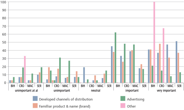 Results related to the importance of marketing tools in Macedonia and Serbia are similar. The highest percentage of respondents from both countries (86% in Macedonia and 69% in Serbia) believe that the developed channels of distribution are important and very important as a marketing activity in this sector, followed by familiar product/name (brand) (71% in Macedonia and 60% in Serbia) and advertising (55% in Macedonia and 30% in Serbia).