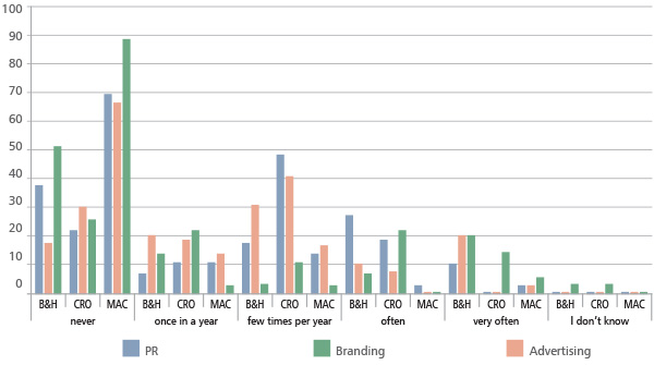 Although most of the respondents in all four countries consider these types of marketing activities (public relations, advertising and branding) to be important and very important, they do not use them in their daily businesses, or they use them only once a year or few times per year (Figure 3).