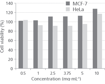 Results showed that the addition of Indigobush extract had stimulatory effect on MCF-7 cells growth at the extract concentrations higher than 1 mg∙mL-1. There was no stimula-tory effect on HeLa cells, except at the highest concentration of Indigobush extract (10 mg∙mL-1). Similarly, the positive effect on the growth of human T-cells (approximately +15%) was observed with the addition of 0.5 g∙L-1 of selected Indigobush fruit extracts compared to the control [8]. In the same study, the methanol fruit extract of Indigobush showed relatively low cytotoxicity of 19% at a maximum concentration of 1 g∙L-1 in normal human lung cell line (HEL299). Despite relatively high tested concentration of the extract (10 mg∙mL-1), in our study, cytotoxic effect on both human tumor cell lines was not observed.