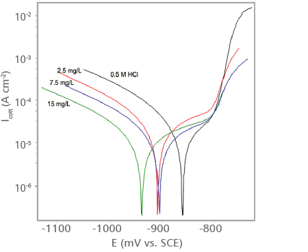 Potentiodynamic polarization curves obtained for aluminum in 0.5 MHCl solution in the absence and presence of various concentrations of Indigobush extract at 25°C are shown in Figure 3a. From this figure is evident that addition of Indigobush extract in HCl solution causes remarkable decrease in current densities and shifts the corrosion potentials in cathodic direction.