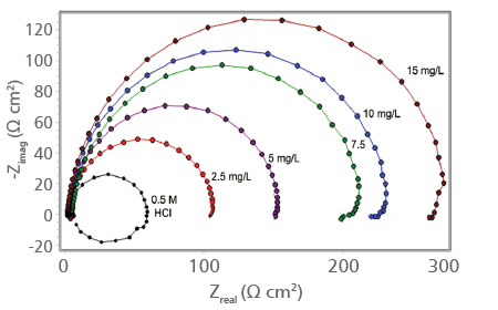 The effects of different concentrations of Indigobush extract on the impedance behaviour of aluminum in 0.5 M HCl solution have been obtained and results are given as Nyquist plots in Figure 3b. By addition of inhibitor to the HCl solution, the diameter of the capacitive loop enlarges, this means that the charge transfer resistance, Rct values increase and an improvement in corrosion resistance of aluminum in acid solution is achieved.