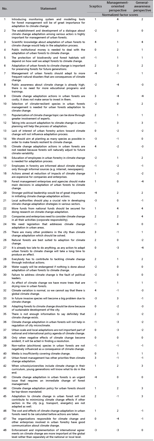 The application of the Q-methodology implied formulating statements about climate change adaptation in urban forests based on the in-depth interviews and literature review. After the test phase, a concourse of 48 statements was created. The Q-surveys consisted of respondents sorting 48 statements, based on their subjective point of view, along a scale of +4 (strongly agree) to -4 (strongly disagree) using provided score sheets. The results of these 23 Q-sorts were then analysed using PQMethod 2.33 factor analysis software (available at: http://schmolck.userweb.mwn.de/qmethod/). As a result shared perspectives are identified and described. Each Q-survey was complemented by a brief follow-up interview, revealing why respondents have agreed/disagreed the most with certain statements [29].