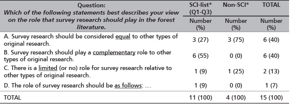 TABLE 3. The role that survey research should play in the forestry literature (n=15; one answer possible)