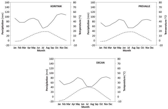 The study areas are natural ecosystems located close to the upper distribution limit of Bosnian pine at Prevalla (42°11’N, 20°57’E; 1945 m a.s.l), Decan (42°36’N, 20°14’E; 1830 m a.s.l), and Koritnik (42°04’N, 20°31’E; 1815 m a.s.l) in western and southern Kosovo (Figure 1) (Table 1). Soil types are based on limestone bedrocks creating leptosols (rendzinas) and brown soils on higher slopes with slight differences among sites. At all sampled sites Bosnian pine is the dominant species while the ground vegetation comprises of species such as: Sesleria autumnalis Ard., Brachypodium sylvaticum Huds., Carex humilis Leyess., Thymus balcanus L., Fragaria vesca L., Festuca heterophylla Lam., Dactylus glomerata L., etc. These forest stands grow under the effect of Continental climate with some influences of Mediterranean climate in the southern Kosovo. Mean annual temperature varies among sampled sites and ranges from 8.0°C (PRE-site) to 8.3°C (KO-site), while the long-term mean annual precipitation ranges from 791 mm (DE-site) to 1029 mm (KO-site) (CRU TS3.22 dataset, period 1901-2013). The weather in the sampled site is characterized by a non-uniform rainfall distribution, with summers that are very short and cold as well as with cold winters with lots of snow. Maximum precipitation falls from October to December, while the minimum rainfall is recorded from July to August (Figure 2). Moreover, natural forest stands of P. helderichii grow on sites with different slope aspects ranging from NW for DE and KO sites to SW for PRE site.