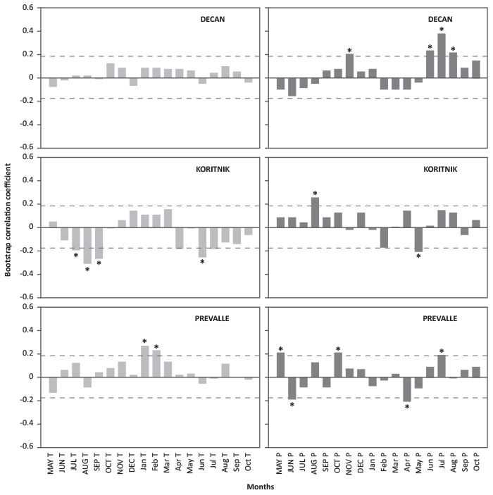 FIGURE 4. Bootstrap correlation coefficients between residual chronologies and temperature (left) and precipitation (right) - asterisks on the top of the bars indicate 95% significance level of the correlation coefficient