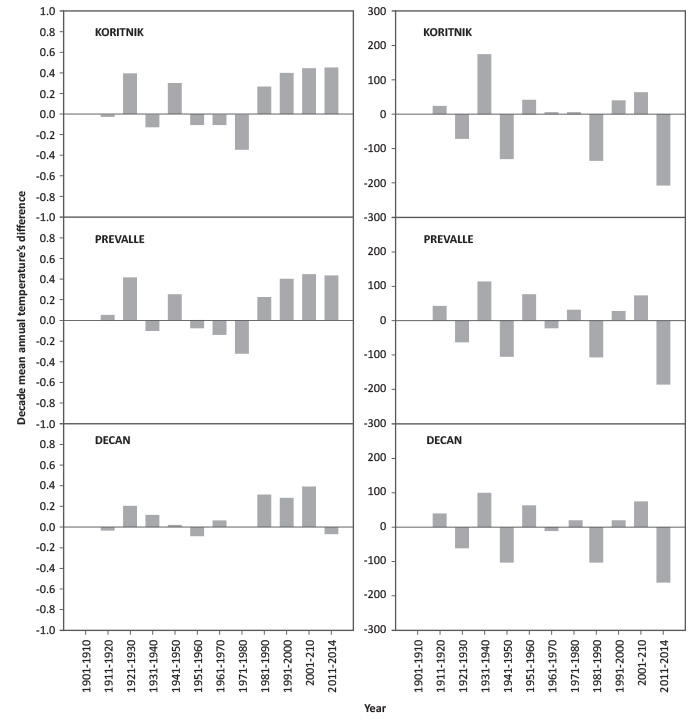 FIGURE 5. Decennial successive differences between mean annual temperatures and mean annual sum of precipitation for the period 1901-2014 (including the period 1951-2013 used as reference in bootstrap correlation analysis)