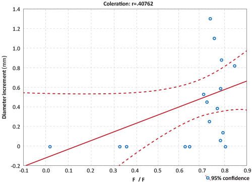 FIGURE 2. Correlations between diameter increment (mm) of container seedlings of narrow-leaved ash and the maximum quantum yield of photosystem II (Fv/Fm) in normally watered seedlings on 16 July 2015