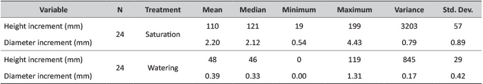 TABLE 1. Descriptive statistics of height (mm) and diameter (mm) increment of container seedlings of narrow-leaved ash (Fraxinus angustifolia Vahl) under conditions of substrate saturation and normal watering between 5 May 2015 and 15 July 2015![]()