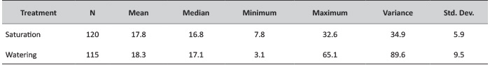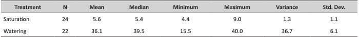 Table 4 provides the results of the descriptive statistics of the total chlorophyll content in the leaf mesophyll (CCI) of seedlings under conditions of substrate saturation and normal watering on 16 July 2015. Seedlings of narrow-leaved ash under conditions of substrate saturation had an average total chlorophyll content index (CCI) in the leaf mesophyll of 17.8 (7.8-32.6), whereas in the case of watered seedlings the above index was 18.3 (3.1-65.1) on average. The t-test results did not show the existence of a statistically significant difference (p=0.6818) in the total chlorophyll content index (CCI) in the leaf mesophyll of narrow-leaved ash seedlings under conditions of substrate saturation and normal watering on 16 July 2015.